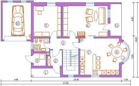 | | | | Pritličje | m2 | | 1 | Nadstrešek | 4,62 | | 2 | Vhod | 3,44 | | 3 | Hodnik | 12,65 | | 4 | Kopalnica | 3,78 | | 5 | Delovna soba | 15,91 | | 6 | Dnevna soba | 25,80 | | 7 | Kuhinja | 9,06 | | 8 | Jedilnica | 18,85 | | 9 | Kurilnica | 2,79 | | 10 | Garaža | 15,72 | | 11 | Terasa | 6,75 | | | SKUPAJ | 119,37 |